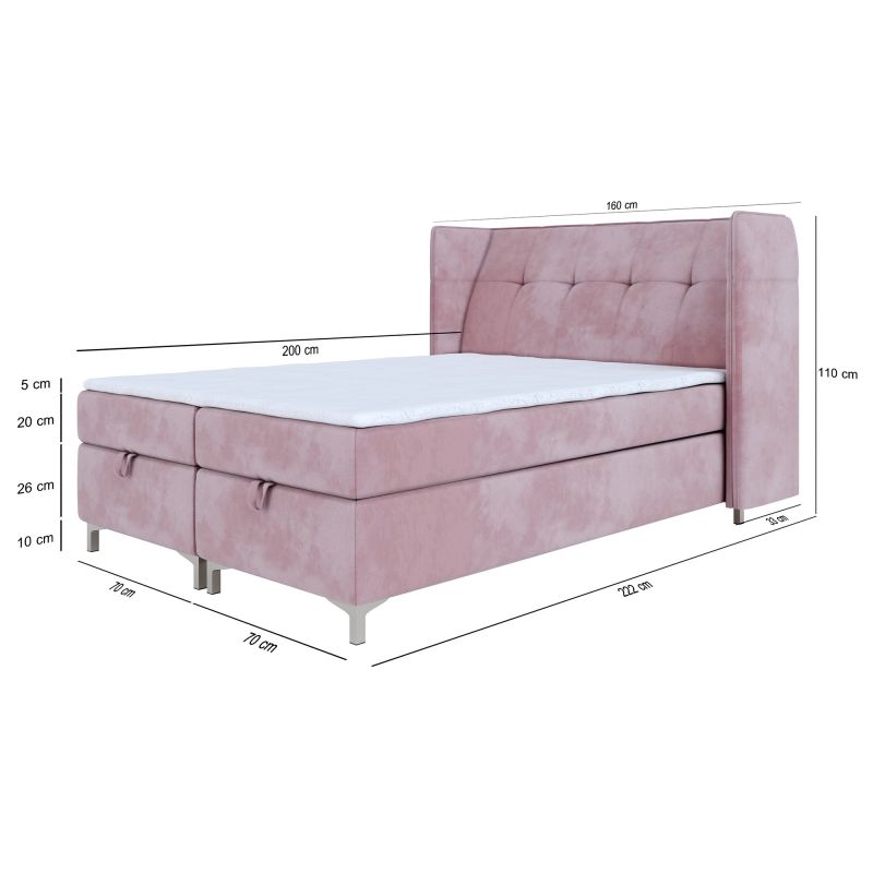 · 160x200 - szerokość całkowita: 180 cm, długość całkowita: 222 cm, wysokość zagłowia: 110 cm, wysokość powierzchni spania: 61 cm.