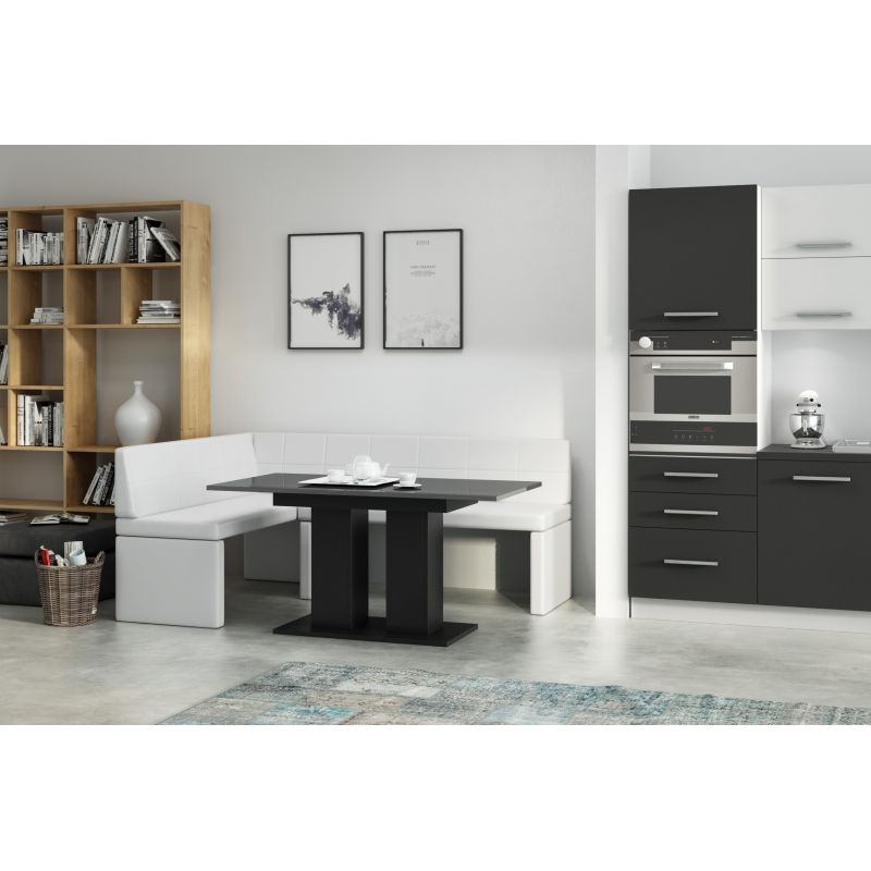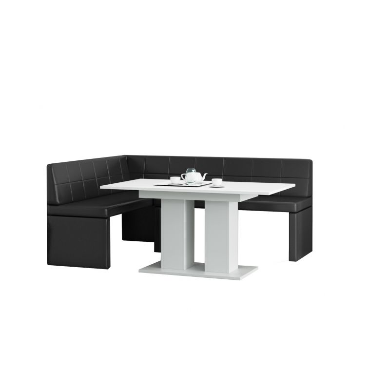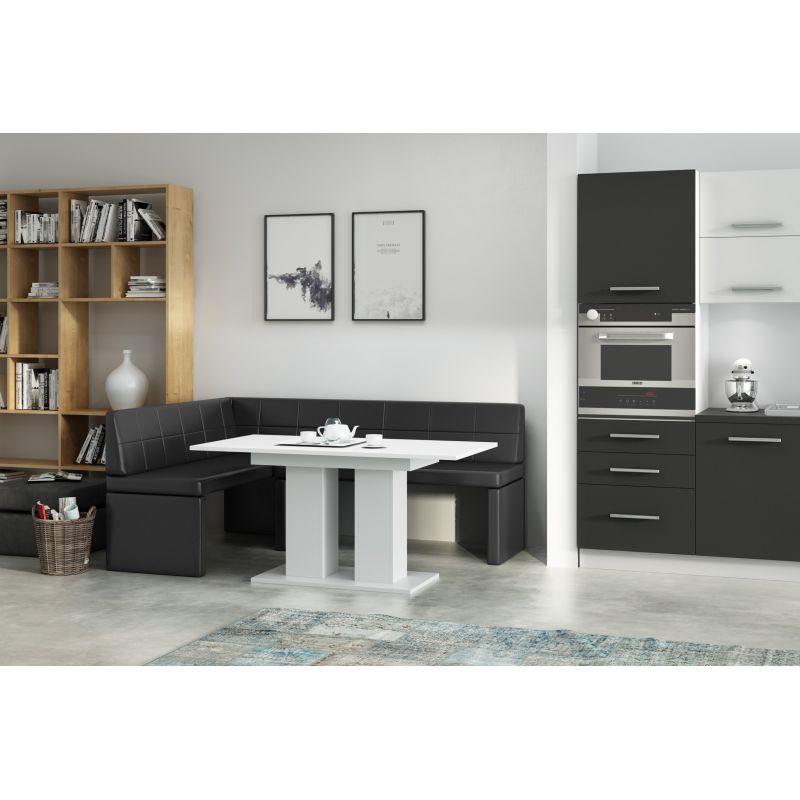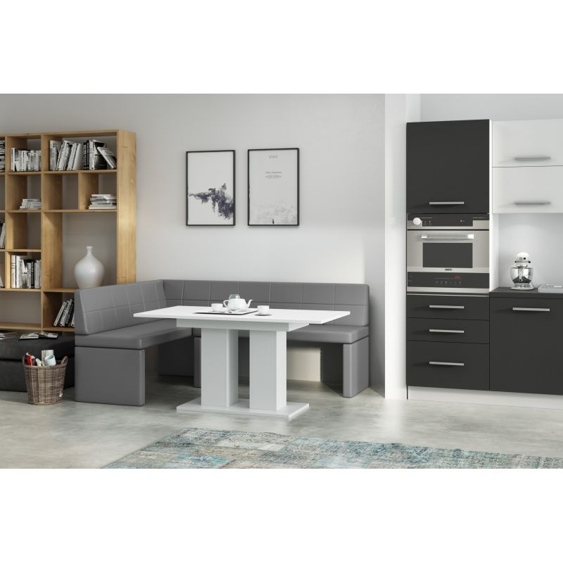 Narożnik kuchenny Marta jest w całości tapicerowany, wykonany w eko-skórze o podwyższonej odporności na ścieranie. Nowoczesny design, bardzo eleganckie przeszycia sprawiają, że pasuje zarówno do nowoczesnej kuchni czy też jadalni, ale również do minimalistycznego salonu.