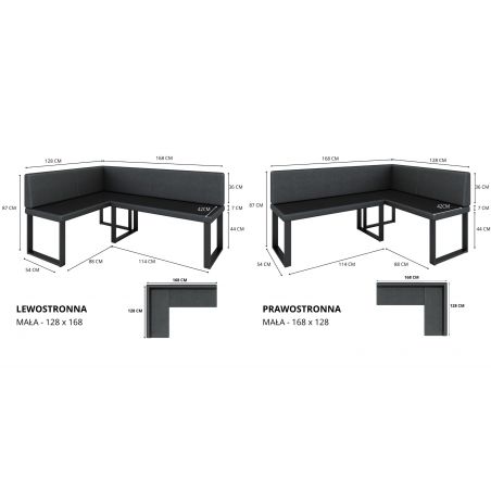 Oferujemy narożnik w wymiarach 128 x 168 cm w opcji lewostronnej lub 168 x 128 cm w opcji prawostronnej w zależności od potrzeb i aranżowanej przestrzeni, ławka szerokości 128 cm i taboret szerokości 50 cm.