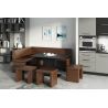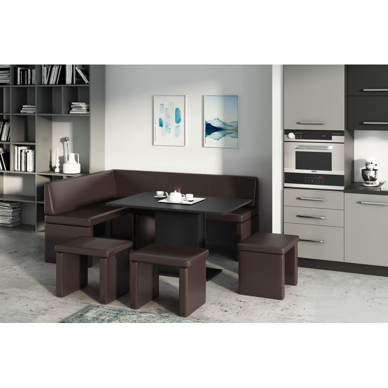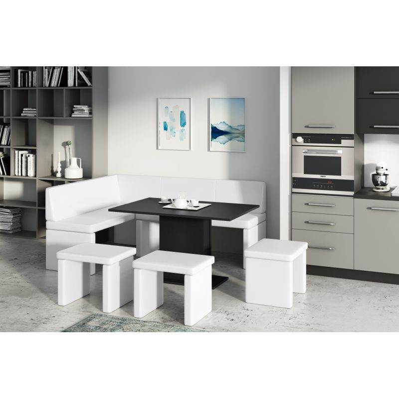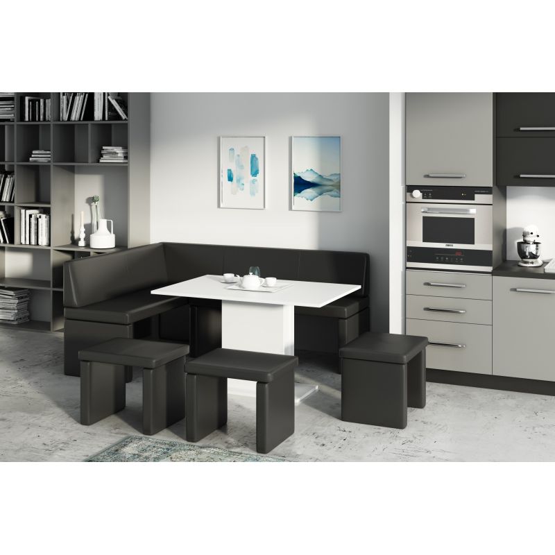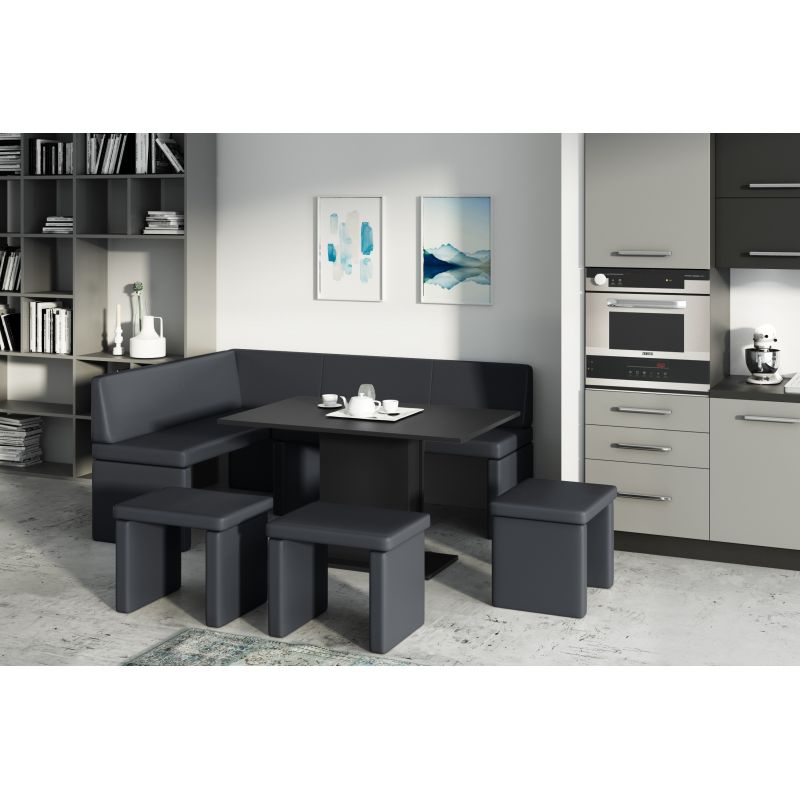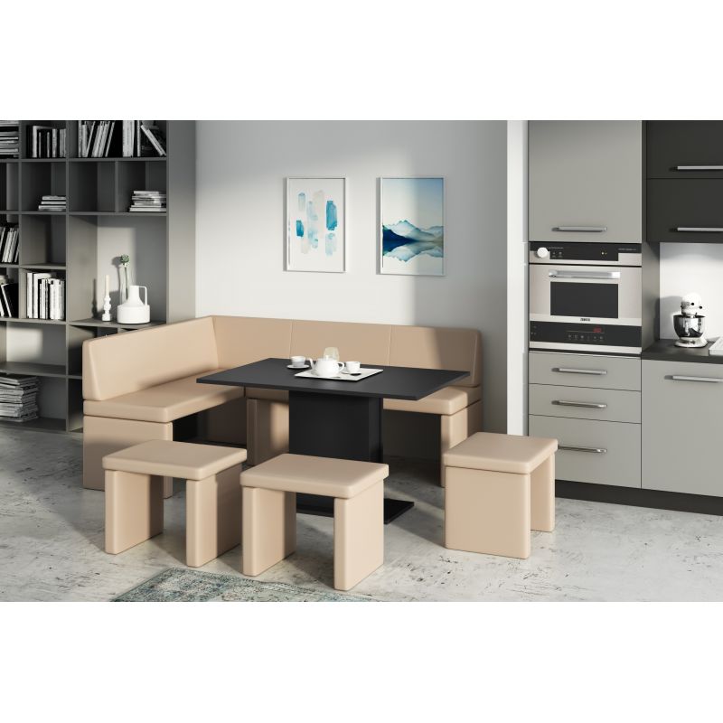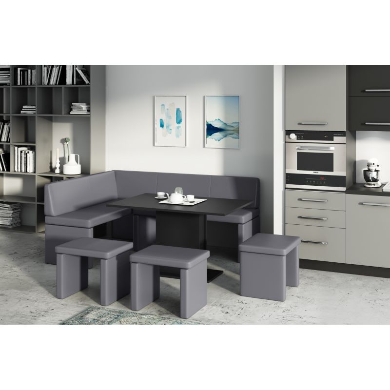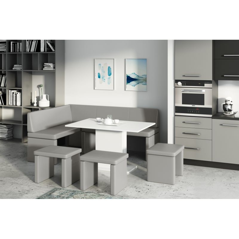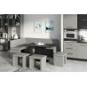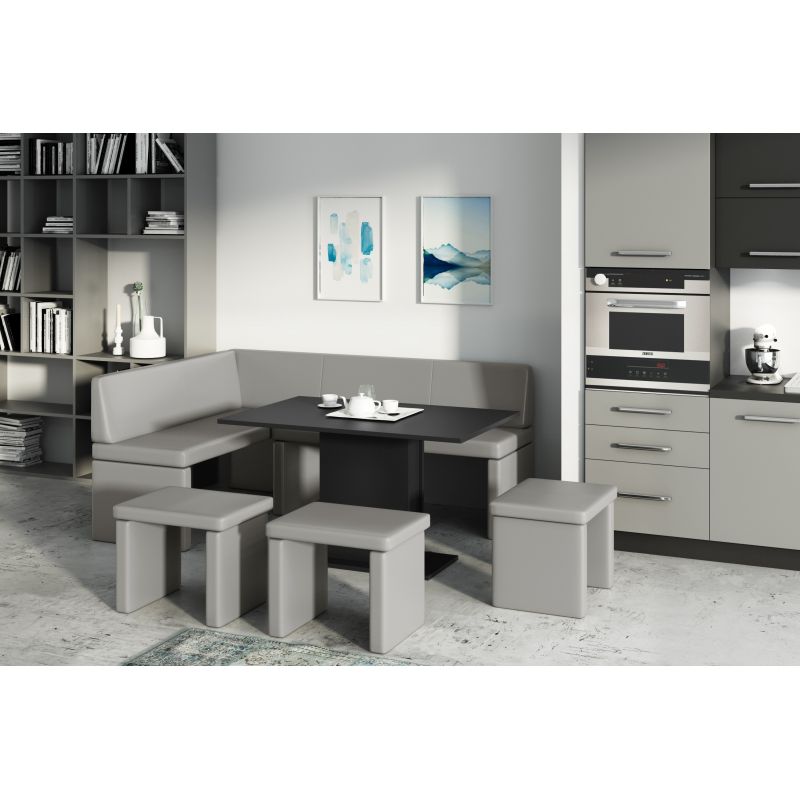 Narożnik kuchenny Olga, ławka pojedyncza i taboret są w całości tapicerowane, wykonane w eko-skórze o podwyższonej odporności na ścieranie. Nowoczesny design sprawia, że pasuje zarówno do kuchni czy też jadalni, ale również do minimalistycznego salonu.